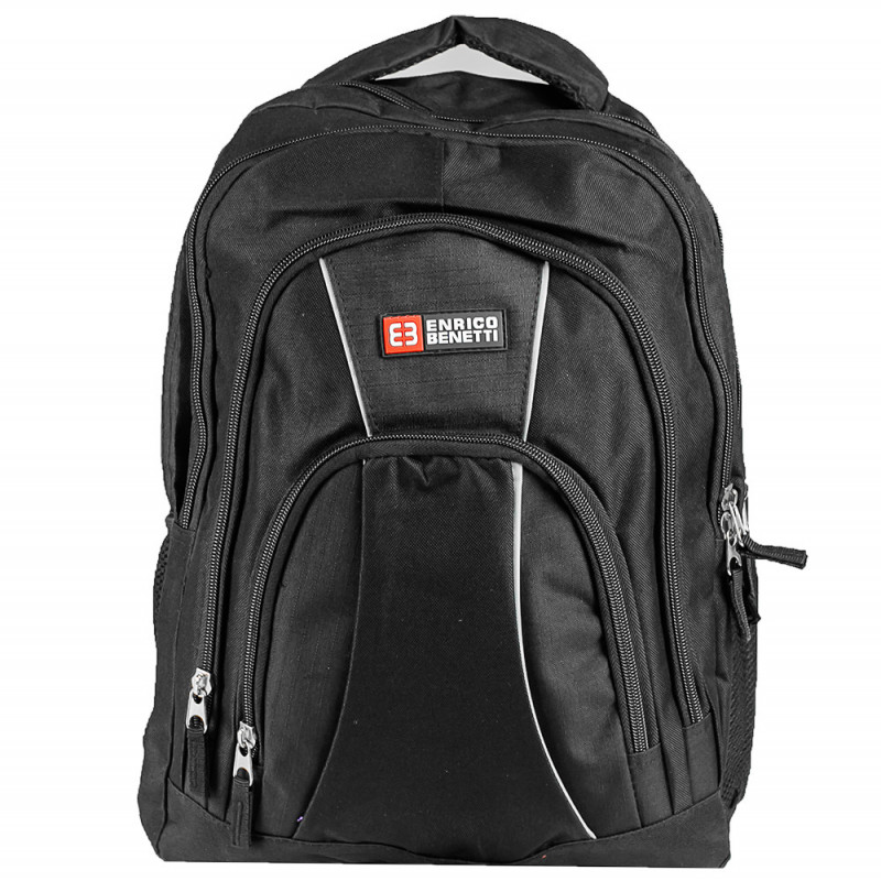 Рюкзак ENRICO BENETTI, серія MARTINIQUE. В такому рюкзаку кожна ваша річ матиме своє місце. Зручні м'які спинка, два основні місткі відділення, є відсік для ноутбука 15,6 і додаткові кишеньки, зручні регульовані плечові лямки, міцна ручка. З боків кишені-сіточки для пляшечок та різних дрібниць. Матеріал - легкоочисний текстиль. Об’єм рюкзака 28 л. Розмір: 32x44x22см Колір - Black-Grey (чорний).