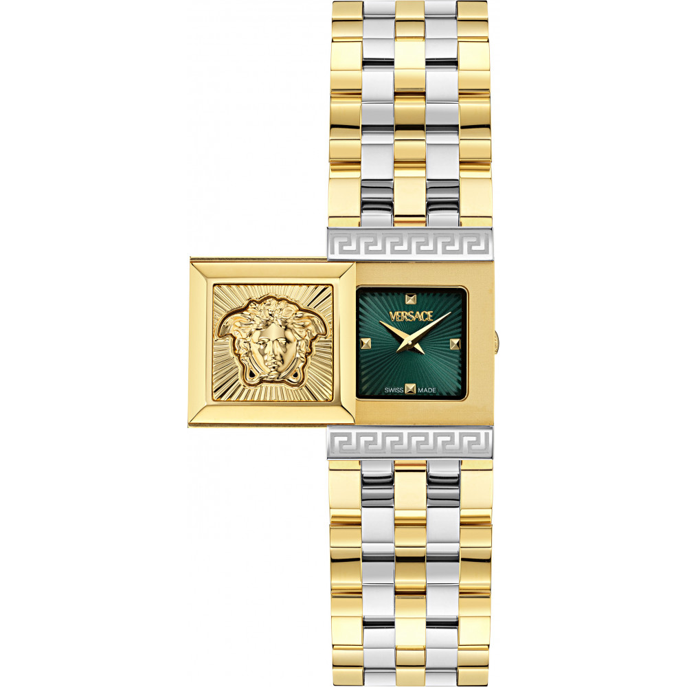 Двоколірний сталевий жіночий годинник-браслет VERSACE REVEAL із зеленим циферблатом - елегантна сталева модель із секретним та таємничим дизайном для вимогливих жінок. Пориньте у чарівний світ годинників Versace Reveal, де секрети розкриваються одним дотиком. Всередині витонченого корпусу ховається справжній скарб елегантності та чарівності. Кожна складна деталь цього аксесуара - від візерунків до виразної панельки з головою Медузи - говорить про жіночність та витонченість. Годинник стане ідеальним доповненням як до офіційного, так і до повсякденного вбрання. Поєднуючи італійську розкіш і швейцарську точність, нетривіальний корпус і ювелірний браслет, Versace Reveal - це не просто годинник, а ювелірна прикраса, яка говорить про стиль та високий клас.